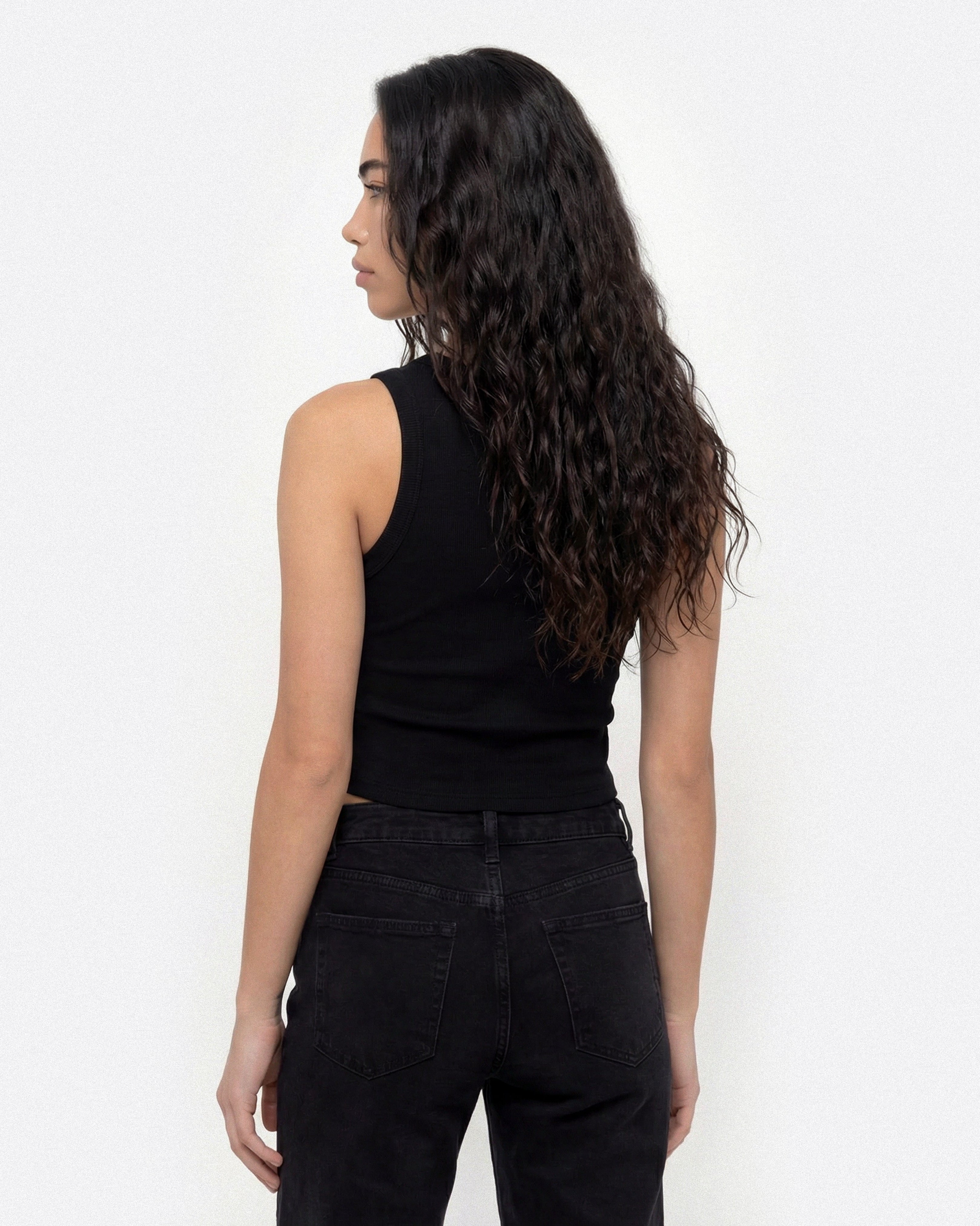 Gefertigt aus 100 % Baumwolle in fein gerippter Struktur – weich, elastisch und angenehm zu tragen. Die dezente Rhouen-Stickerei auf der Brust setzt einen klaren, ruhigen Akzent. Der leicht verkürzte Schnitt verleiht dem Top eine moderne, schlanke Silhouette.