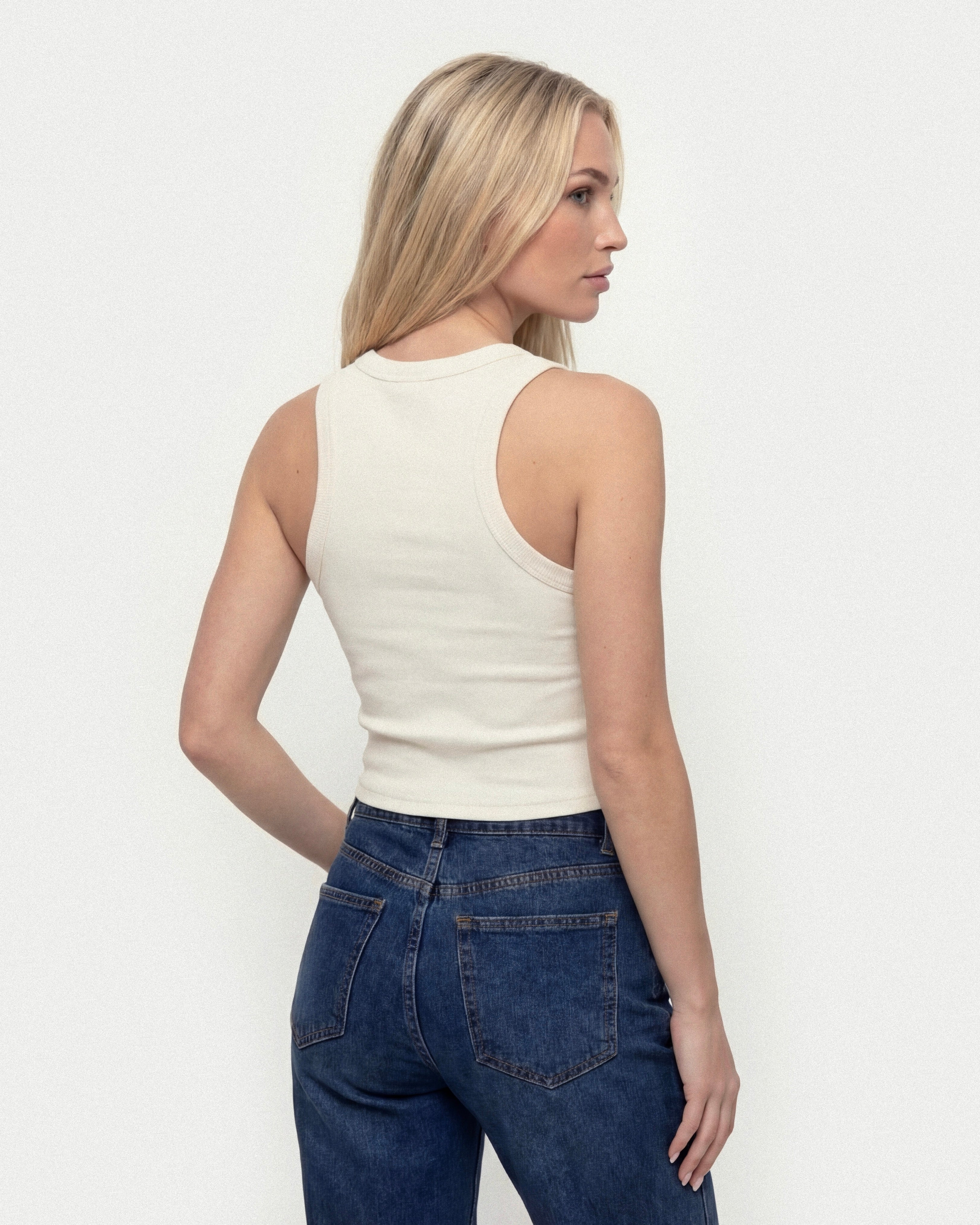 Gefertigt aus 100 % Baumwolle in fein gerippter Struktur – weich, elastisch und angenehm zu tragen. Die dezente Rhouen-Stickerei auf der Brust setzt einen klaren, ruhigen Akzent. Der leicht verkürzte Schnitt verleiht dem Top eine moderne, schlanke Silhouette.