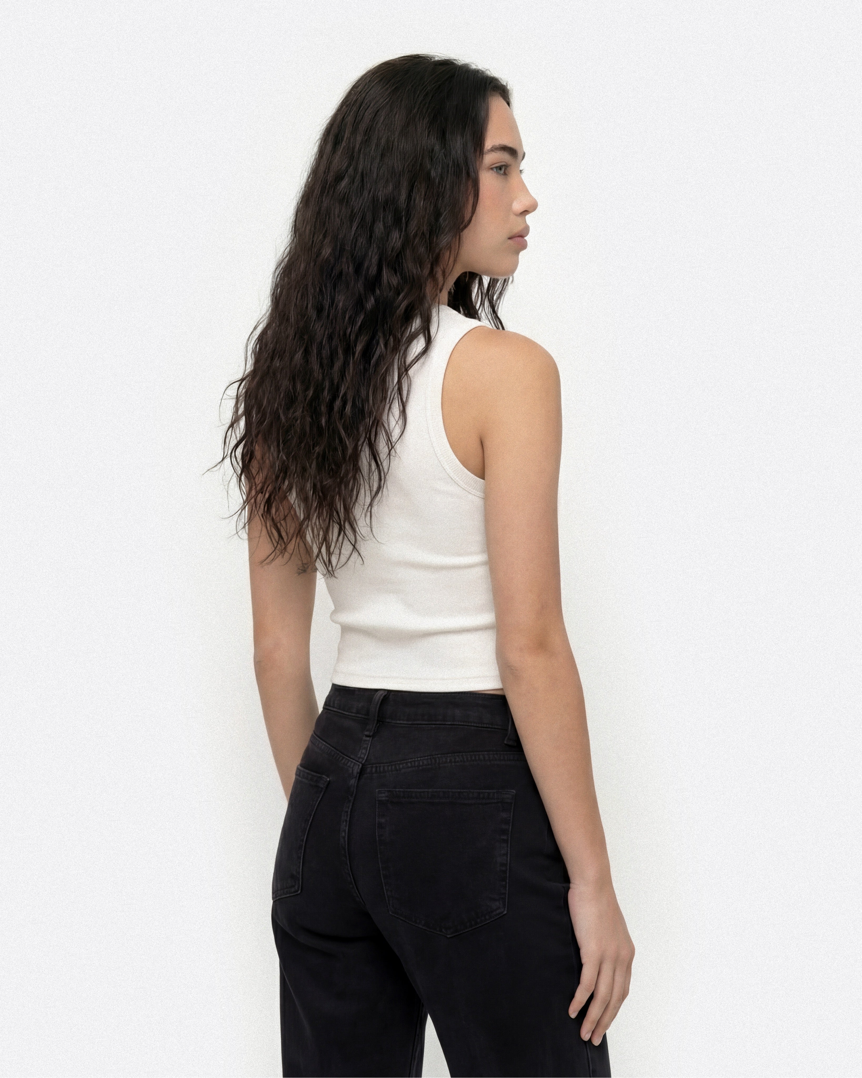 Gefertigt aus 100 % Baumwolle in fein gerippter Struktur – weich, elastisch und angenehm zu tragen. Die dezente Rhouen-Stickerei auf der Brust setzt einen klaren, ruhigen Akzent. Der leicht verkürzte Schnitt verleiht dem Top eine moderne, schlanke Silhouette.